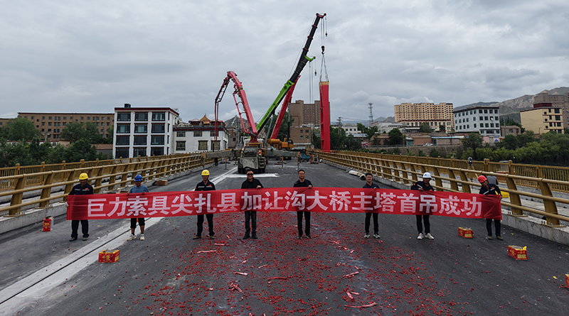 6月20日,加讓溝大橋主塔首吊作業取得圓滿成功,巨力索具股份有限公司承建了該項目的所有上部懸索結構,包括基座及主塔鋼結構,索鞍和索夾鋼結構,懸索橋主纜,吊桿用鋼拉桿及錨固鋼拉桿。