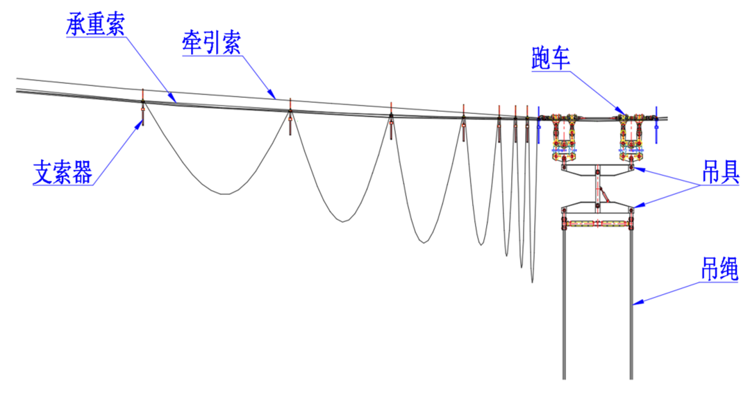 纜索吊裝系統(tǒng)主要由塔架支撐系統(tǒng)、錨固系統(tǒng)、繩索系統(tǒng)、天車和支索器系統(tǒng)、防雷系統(tǒng)等組成,并搭載了數(shù)字化工程管控平臺,通過自動監(jiān)測設備、監(jiān)控設備、外鏈系統(tǒng)等智慧工地的構建,實現(xiàn)對吊裝現(xiàn)場檢查全方位時時監(jiān)控,極大地提升了施工項目安全生產的總體管控能力。