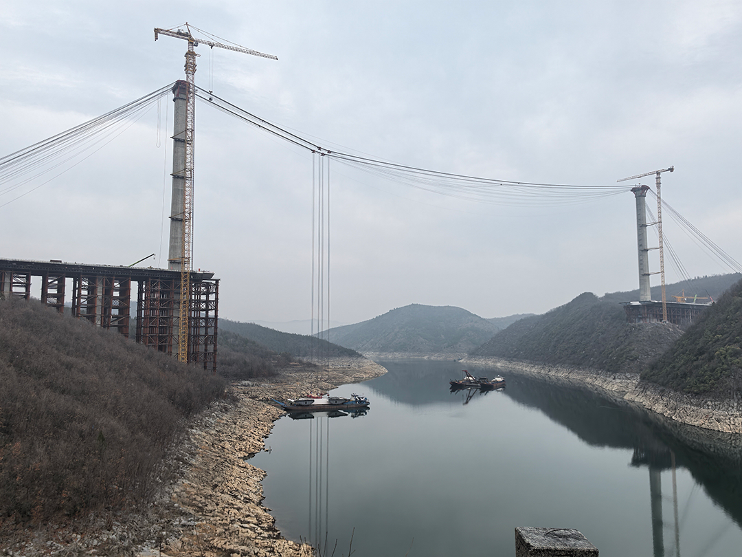 丹江小三峽特大橋地處鄂豫交界的丹江口水庫庫區(qū),是連接南北交通的重要節(jié)點工程。大橋全長919米,主跨536米,是目前國內最大跨徑跨峽谷分離式混合梁斜拉橋,橫跨陡峭峽谷,施工環(huán)境復雜,傳統(tǒng)吊裝設備難以滿足高空、大跨度、重載荷的作業(yè)需求。巨力索具針對項目特點,量身定制了雙塔三跨式纜索起重機系統(tǒng),其跨度、起重量及智能化控制水平均達到行業(yè)領先標準。