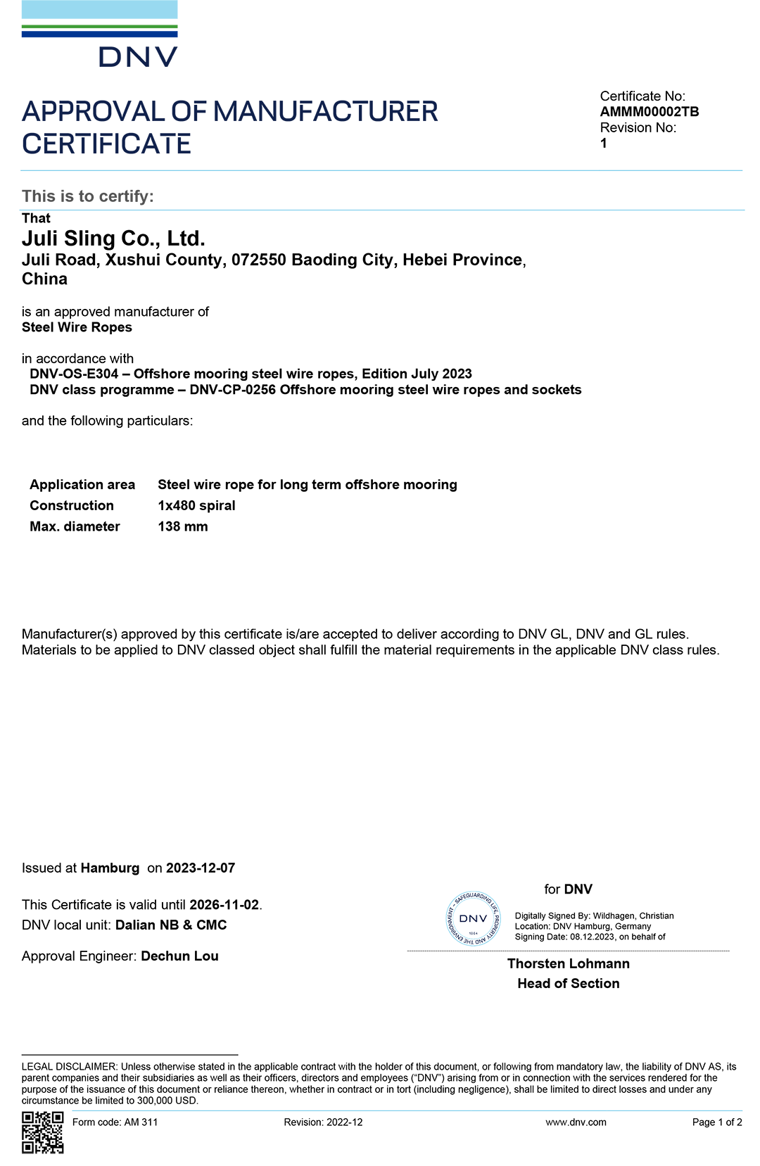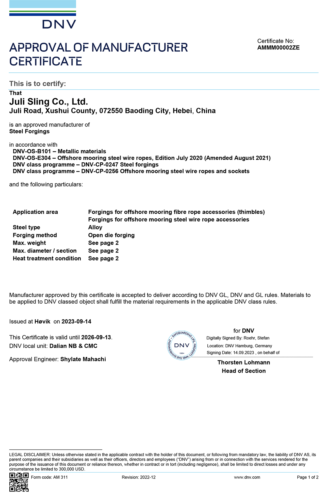 DNV長期系泊鋼絲繩接頭及纜繩套環(huán)鍛件工廠認(rèn)可證書