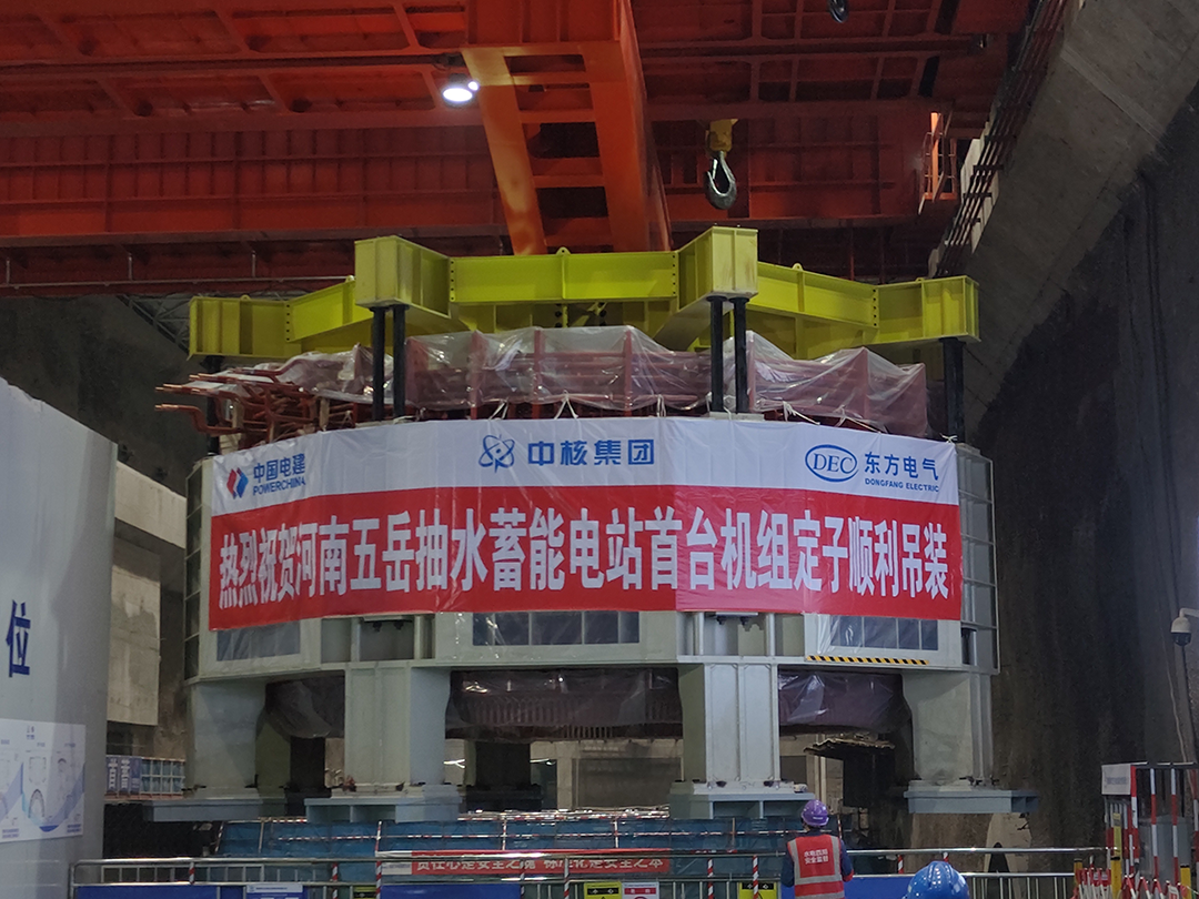 2024年3月27日,中國水電四局承建的河南五岳抽水蓄能電站首臺機組定子吊裝就位,巨力索具制造的350T定子起吊工具全程保障該項目吊裝順利進行,巨力索具從項目立項之初就與東方電機技術研發團隊反復優化吊裝方案,確保吊具與定子外形尺寸高度契合,吊裝形式安全可靠。