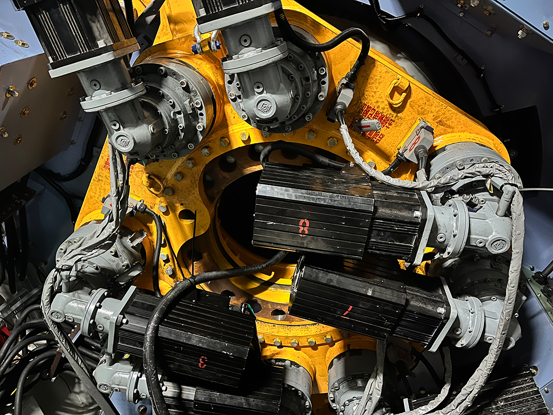 單葉片吊裝配套的盤車工裝采用創(chuàng)造性的8個(gè)電機(jī)驅(qū)動(dòng),優(yōu)秀的控制程序,均衡了驅(qū)動(dòng)的受力。機(jī)載控制面板和手持平板電腦均可查看和控制盤車使用過程。剎車裝置采用電機(jī)抱閘剎車和機(jī)械剎車雙重保障。