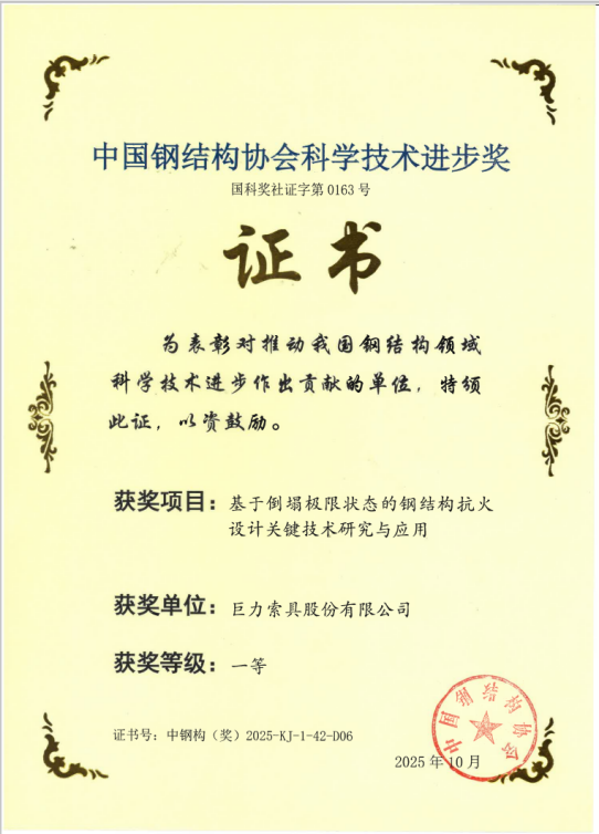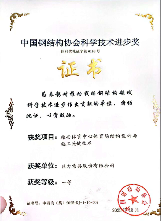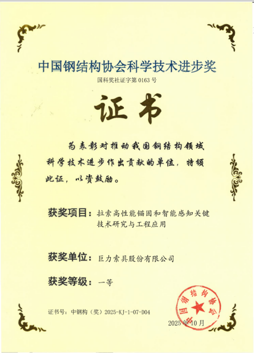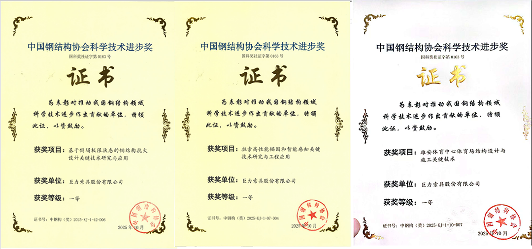 技術(shù)創(chuàng)新再獲權(quán)威認(rèn)可!巨力索具榮膺三項(xiàng)中國鋼結(jié)構(gòu)協(xié)會(huì)科學(xué)技術(shù)進(jìn)步獎(jiǎng)一等獎(jiǎng)
