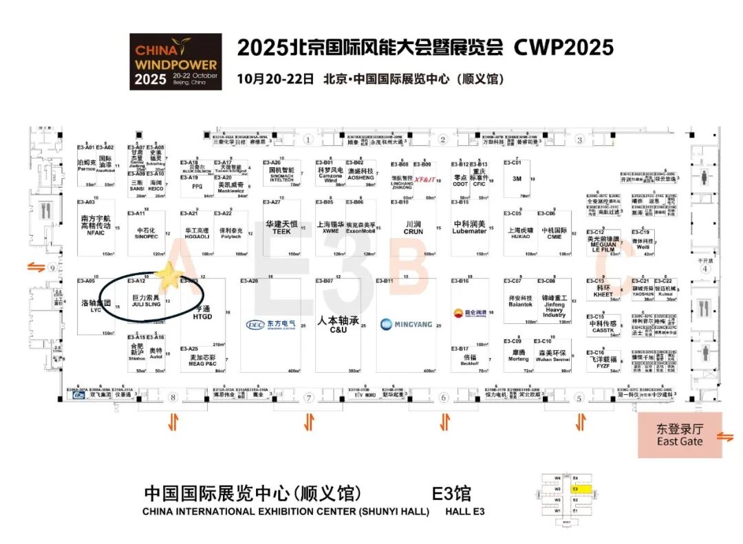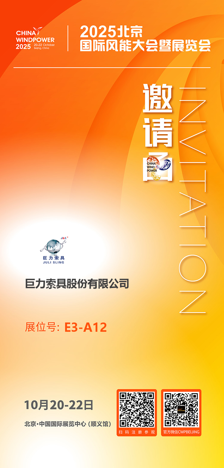 2025年10月20日—22日,CWP2025將在北京·中國國際展覽中心(順義館)舉行,本屆大會以“推動全球能源轉型,攜手實現可持續發展”為主題,展會規模達12萬平方米,將匯聚全球風電領域專家、全產業鏈近千家企業及超十萬名專業觀眾。在這場行業盛會中,巨力索具在【E3-A12】恭候您的光臨,誠邀您親臨見證,與我們攜手并肩,共同開啟一場關于風電未來、能源變革與地球可持續發展的巔峰對話。