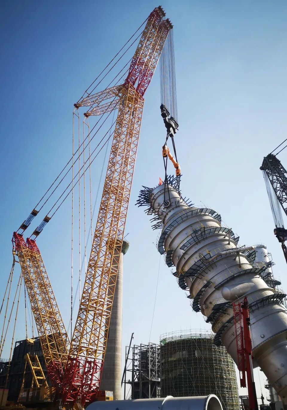 巨力索具的2000t級平衡梁、無接頭繩圈,將盛虹煉化一體化項目常減壓蒸餾裝置中直徑14米,高58米,吊重1717噸的減壓塔順利吊裝就位。